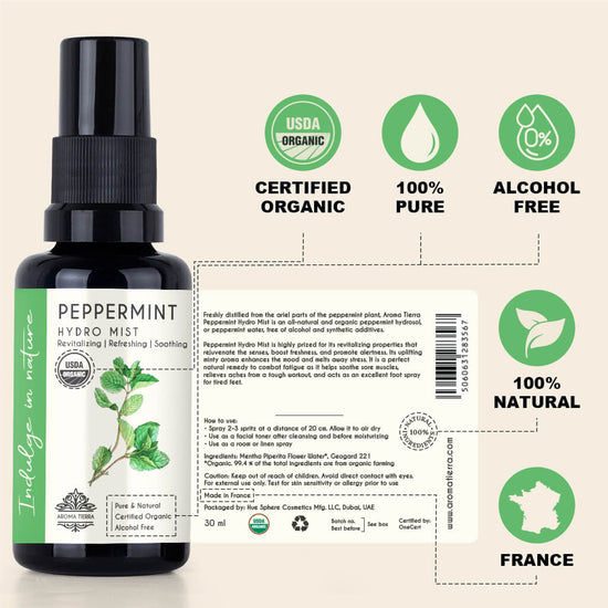 Freshly distilled from the ariel parts of the peppermint plant, Aroma Tierra Peppermint Hydro Mist is an all-natural and organic peppermint hydrosol, or peppermint water, free of alcohol and synthetic additives.